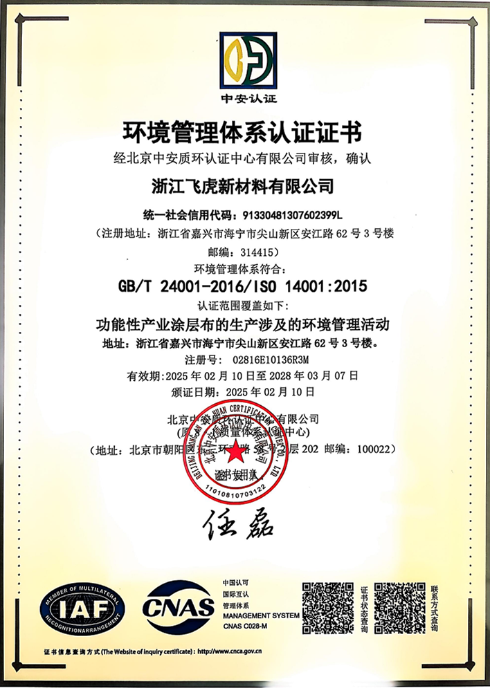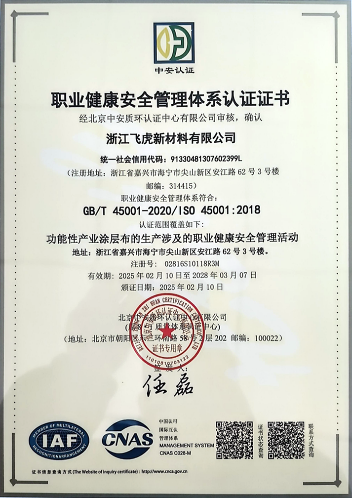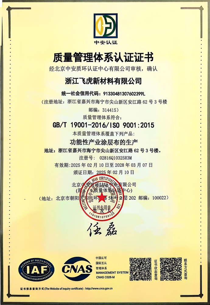 公司位于长江三角经济带的中心,交通便利,现拥有多条先进刀刮涂层线与浸胶生产线,年产量可达3000万平方米。浙江飞虎新材料专业致力于PVC刀刮涂层织物的研究与开发, 业务涵盖整经,织造,涂层,检验, 销售以及售后服务各个环节,提供客户专属定制服务。